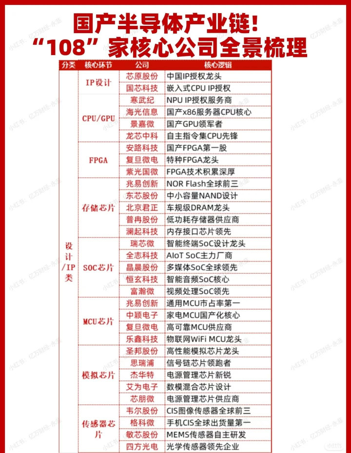 4. 代表性强:包括各个细分领域的龙头或潜在龙头,如中芯国际(制造)、北方华创(设备)、兆易创新(存储/MCU)、韦尔股份(CIS)、华为相关供应链企业等。