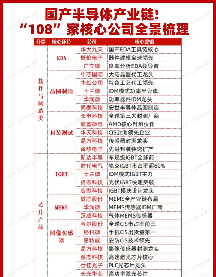 核心逻辑:从芯片制造、封测到具体产品应用(如功率器件、传感器、图像传感),体现了半导体产业链的完整闭环与国产化进程。